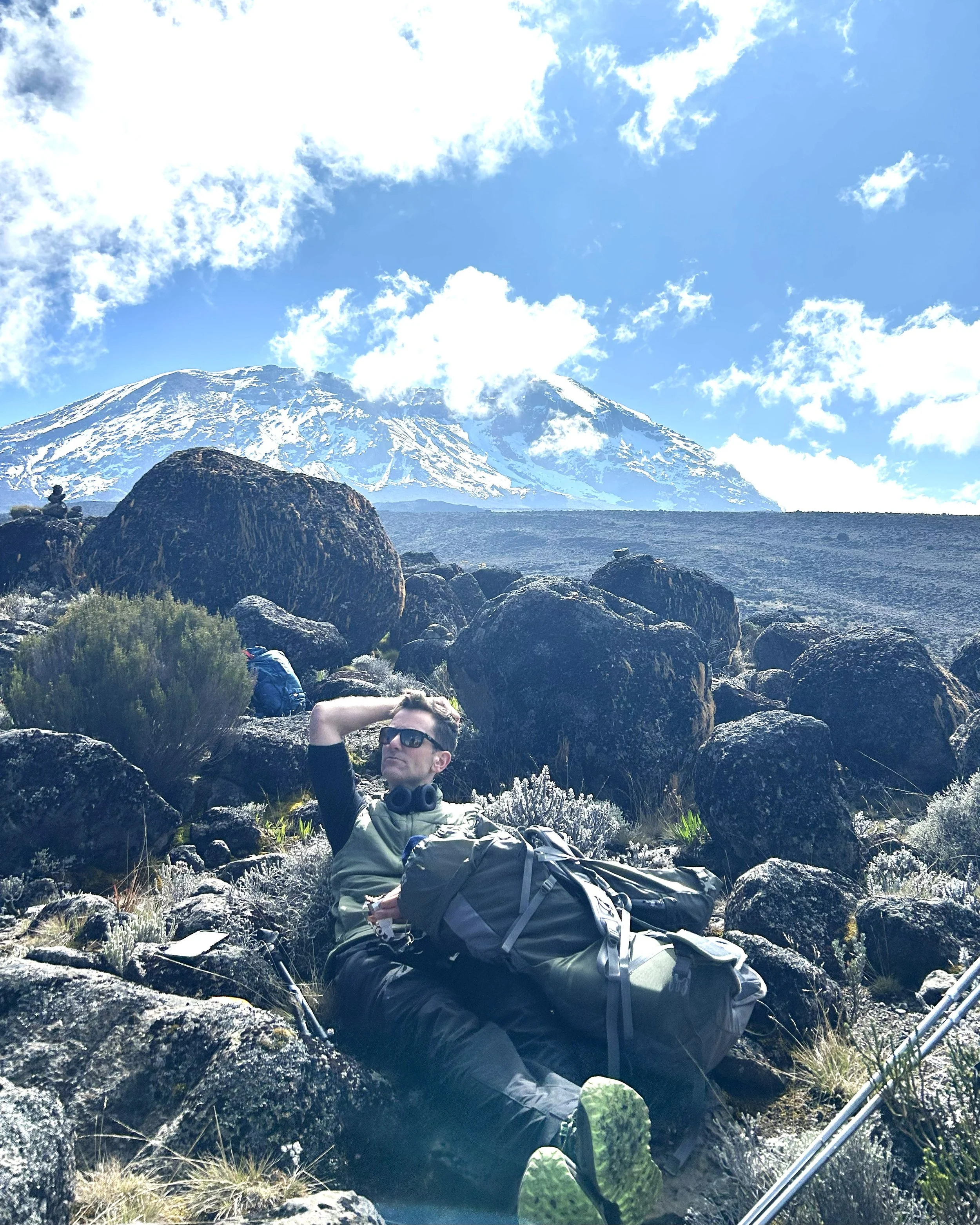 Svein Eivind Gilje (bror) på Machame ruten, med Kilimanjaro i bakgrunnen.